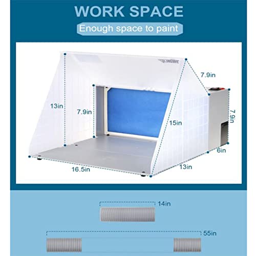 【Met hulpgereedschap】: het is geschikt voor toepassing bij het maken van modellen. Veelzijdige, inklapbare spuitcabine met draaiplateau, ventilatieslang en filter. Werkt in de hele winkelruimte omdat het systeem spatwater filtert en schadelijke lucht uit deuren of ramen afvoert.