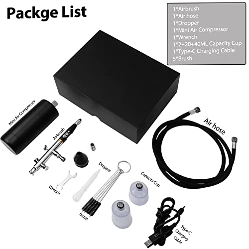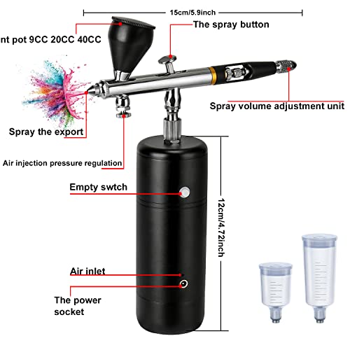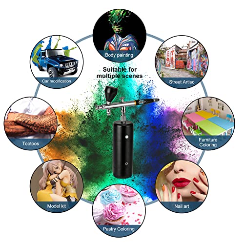 Mini draadloze airbrush-set: de mini-draadloze airbrushset is een schildergereedschap dat geschikt is voor verschillende scènes, zoals B. schilderen, make-up, SPA, lichaamsbeschildering, modelkleuring enz. De hoge druk van de airbrush heeft genoeg kracht om fijne nevel vrij te maken, presenteert verschillende kleuren, zodat je vrij een groot aantal kleuren en patronen kunt maken volgens je eigen voorkeuren en behoeften.