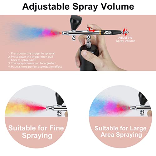 Dual Action Airbrush: deze dual-action-airbrush-kit (double-actie) kan niet alleen de luchtstroom aan het einde van het airbrush-pistool regelen, maar ook het pigmentvolume op de knop op de airbrush-pen. Een double-action-trekker biedt je ongelooflijk veel controle en maakt de variatie van fijne tot brede lijnen mogelijk. Geschikt voor een groot aantal doeleinden, biedt een consistent spuitpatroon van professionele kwaliteit en voldoende controle om de kleinste ontwerpen te hanteren.