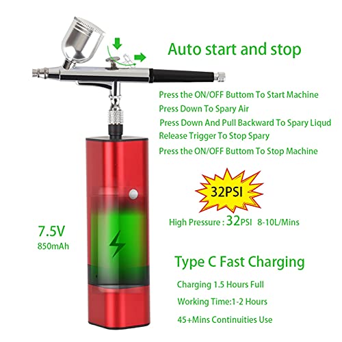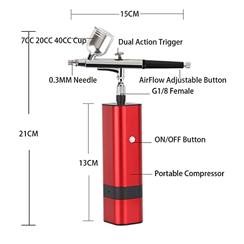 DRAAGBAAR EN MULTIFUNCTIONALAIRBRUS Haarbrushpainting Kit kan in uw rugzak of zak worden geplaatst, het is lichtgewicht en gemakkelijk te dragen. Portable Cordless Airbrush Kit kan worden gebruikt voor cake decorating, make-up, nagelsontwerp, tattoo, modelschildering, kunst schilderij, handwerk enzovoort. De airbrush moet na elk gebruik grondig worden schoongemaakt om mondstuk te voorkomen of ongelijkmatig spuiten.