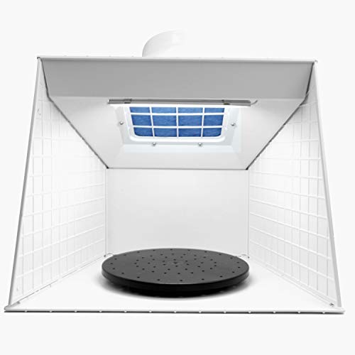 Perfect voor kleine voorwerpen, van keramiek tot snoerloze modellen. Het bevat een draaiplateau waarmee alle te schilderen gebieden gemakkelijk kunnen worden bereikt. Uitgerust met een ventilator van 220 volt 25 W. Het maakt gebruik van een filtersysteem van glasvezel. De houder is ontworpen om grotere deeltjes uit de lucht te verwijderen.