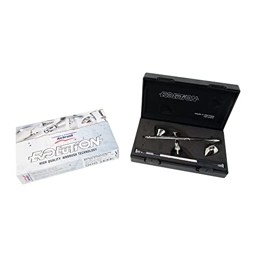 Evolution Silverline FPc 126103 Airbrush-pistool: het Silverline is in dezelfde beproefde constructie gemaakt als de klassieke evolutie. In het verschil beschikt hij over een veranderd, oplosmiddelbestendig middenstuk en extra kleurbegrenzing in mooi design. De Silverline modelserie is zeer geschikt voor de modelbouw, omdat oplosmiddelbestendig is. De Evolution Silverline is verkrijgbaar als solo-, twee-in-één en fPc Two in One-variant. Door simpelweg draaibeweging van de buitenste stelhuls van het luchtventiel (fPc), kan de luchttoevoer van ca. 20 tot 100 procent regelen. Goed geschikt voor textielbewerking. Inhoud levering: fPc Two in One: – lucht-/kleurregelingsproeierset 0,15 mm gemonteerdsproeierset 0,4 mm meegeleverdkleurbeker 2 ml gemonteerdkleurbeker 5 ml meegeleverdapparaat in exclusief etui