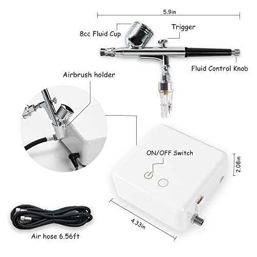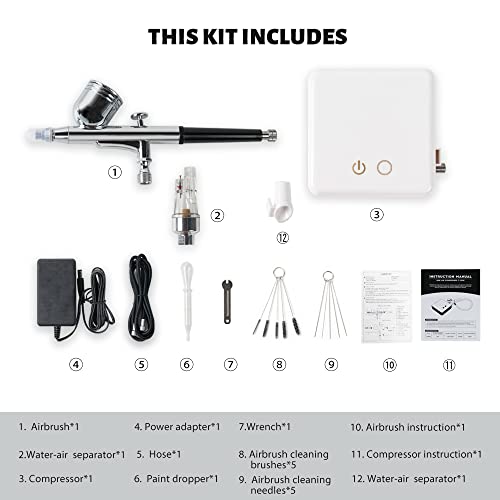 Lightwish professionele airbrush-compressorkit, geschikt voor make-up, nagelstudio, modelschilderen, taartdecoratie, tatoeage enz. Deze airbrushkit wordt geleverd met een krachtige compressor, het perfecte gereedschap voor beginners tot ervaren schilders, die kan worden gebruikt voor make-up, nagelschoonheidsproeven, modelschilderen, kunstcreatie, taartdecoratie, kunstcreatie, illustraties, T-shirts, autokunstkunstkunstkunstkunstkunstkunstkunst. Modelschilderij en meer. Je kunt je creativiteit zo ver uitbreiden als je wilt. Het is een ideaal cadeau van een airbrush starterkit voor familie of vrienden. Spuit zoals je wilt: de luchtdruk van de luchtpomp kan worden omgeschakeld tussen twee niveaus, 25 psi voor de eerste stand en 20 psi voor de tweede fase, het kan aan je verschillende eisen voor de drukregeling voldoen; de knop aan het einde van de airbrush regelt de hoeveelheid uitgaande verf, of het nu voor kunst, schoonheid, modelschilderen of taartdecoratie is, deze kit kan een krachtig gereedschap voor je zijn. Soepele bedrijfservaring: druk de trekker op het airbrush-pistool naar beneden om de lucht af te voeren, druk de trekker naar beneden en trek hem dan terug om de kleur vrij te maken, en de compressor schakelt automatisch uit nadat je de trekker hebt losgelaten. Het dual-action-ontwerp zorgt voor een soepelere werking. Gestroomlijnd ontwerp, eenvoudig vast te houden: het airbrush-pistoollichaam zit vol met het moderne gevoel voor gebogen, gestroomlijnd ontwerp, licht en eenvoudig vast te houden, waardoor de vermoeidheid van je hand effectief wordt verminderd als je je op lange werkuren concentreert. Wordt geleverd met veel accessoires: wordt geleverd met een 2 meter lange luchtslang, je sproeiproces is niet meer beperkt tot een klein oppervlak; de water-luchtscheider kan het binnendringen van water in de luchtslang en de compressor effectief voorkomen en zo de