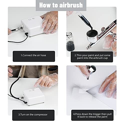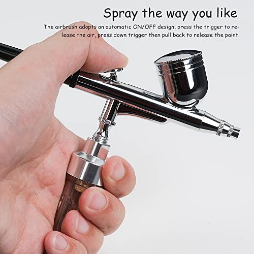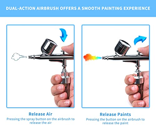 🎨 Dual-action zwaartekracht-airbrushpistool: druk met de dual-action sproeiknop op de airbrush om de lucht af te voeren, de trekker naar beneden en trek hem dan terug om de kleuren vrij te maken. Daardoor biedt het een soepele schilderervaring, ongeacht grote schilderen of details.