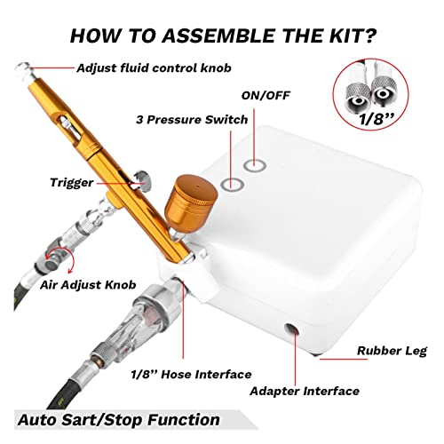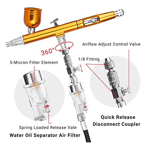 Specification: Verfspuit Auto Stop Functie Dual-Action Airbrush Met Compressor 0.2mm/0.3mm/0.5mm Gold Kit Spuitpistool Power Touch Switch Cake Model voor Thuis Binnen- en Buitenmuren, Plafond, Fen